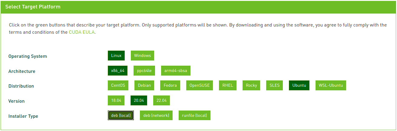Installer Type에서 deb를 선택할 경우 CUDA 최신 버전이 설치된다. runfile을 선택해서 11.3을 설치하려 했지만 설치가 잘 진해되지 않아 deb로 설치하였다.