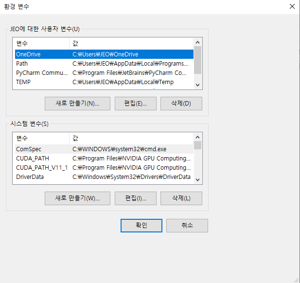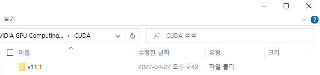 CUDA 설치가 완료되면 C:\Program Files\NVIDIA GPU Computing Toolkit\CUDA\v11.1 폴더가 하나 생성되고 CUDA_PATH 환경변수가 추가된다.