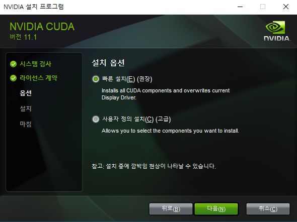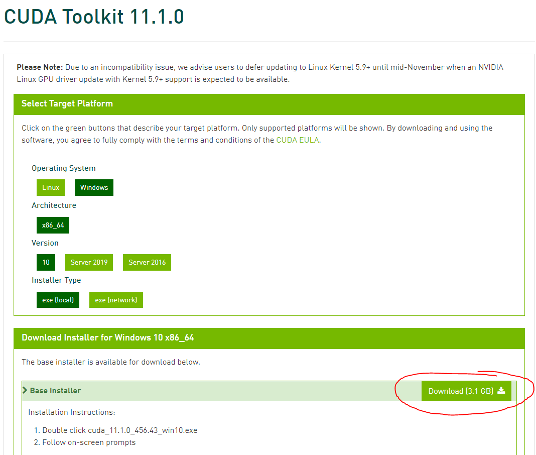 30 시리즈 이상은 CUDA 11 20 시리즈 아래는 10.2를 설치하면 웬만하면 호환된다. 필자는 3060ti이므로 CUDA 11.1을 설치